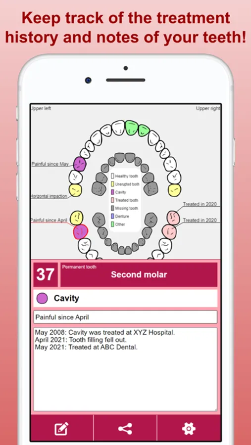 For each tooth, you can edit and save text. You can keep track of various information such as the history of dental treatment, detailed condition, and dates when the teeth grew or fell out of the teeth.