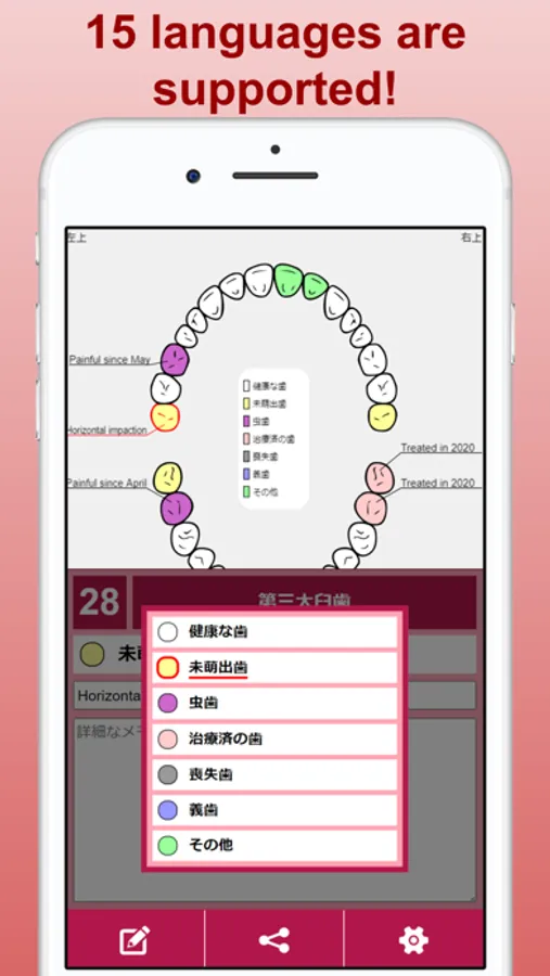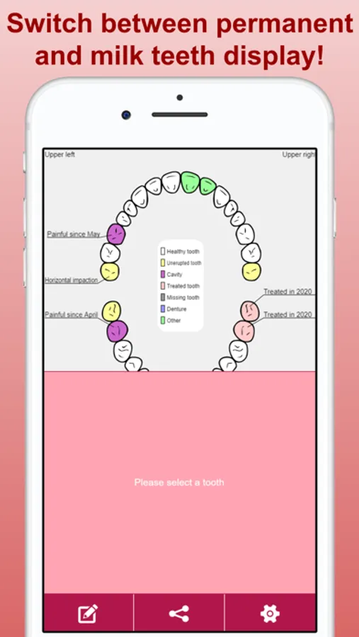 You can select and save the condition of each tooth, such as "healthy tooth," "cavity," "denture," etc. The tooth condition is indicated by color-coding on the screen.