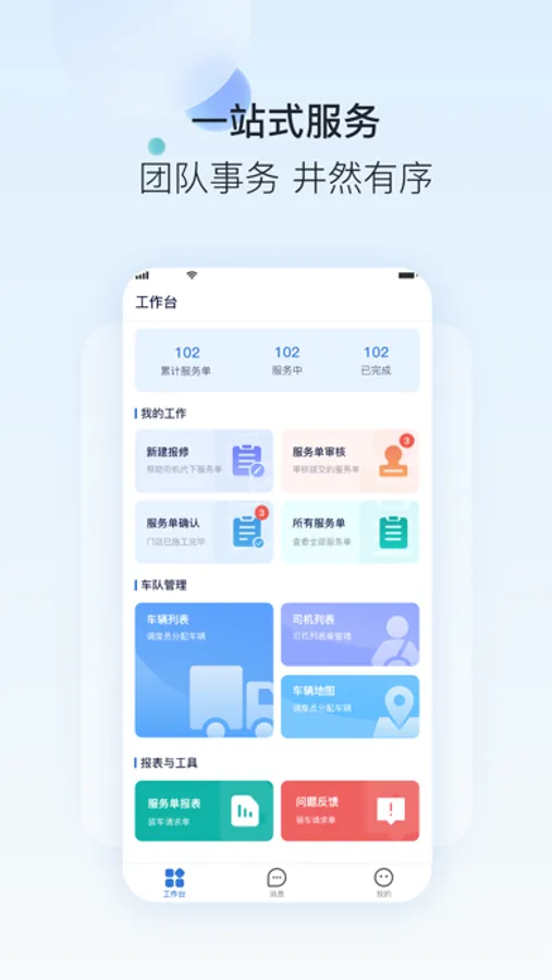 一条工单由创建到分发再由具体实施到服务确认是复杂且完整的闭环,一流卡服将[司机报修/救援工单创建] → [车队长同意/拒绝] → [服务门店接单/实施/存证/报价] → [司机检验确认] → [车队长确认/驳回] 这条复杂的流程整合在线上,工单状态显而易见,流程走向触手可及,动态管理跃然指上