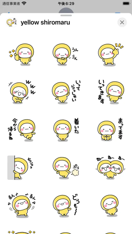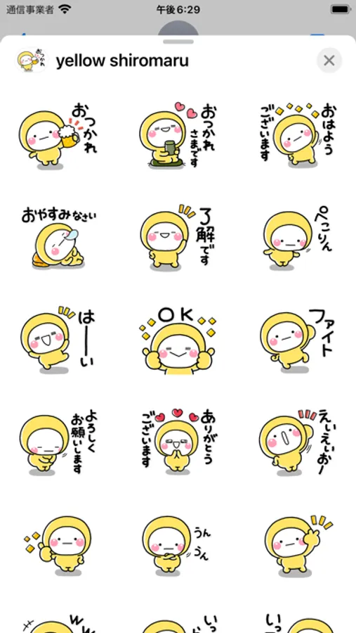 黄色のタイツを着たしろまるの基本ステッカーです。ずっと使える内容を揃えましたのでステッカー初心者の方にもオススメです。【作:いしいともこ】