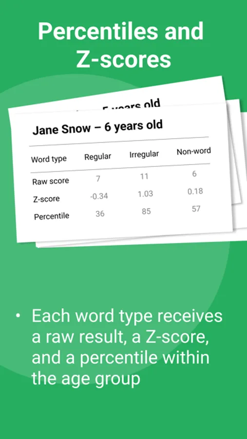- Automated percentile and Z-score calculations for regular, irregular, and non-words.