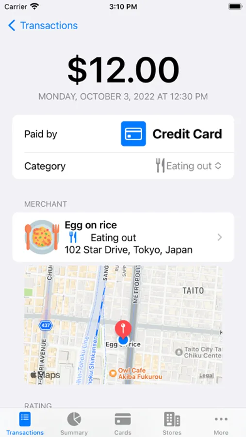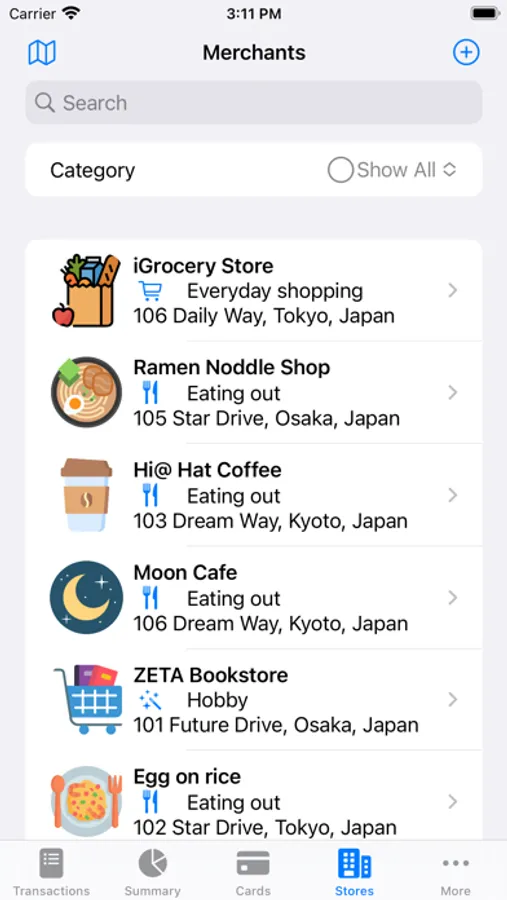 - Record spending by searching for nearby merchant name. The category, location, and other shop details will be filled in as you tap a found nearby merchant.