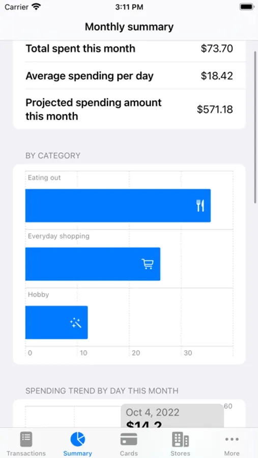 - View monthly analysis, including total spent amount, average daily spending, and estimated monthly spending trend
