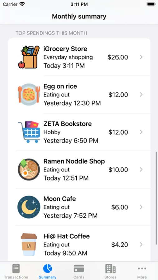 Record your daily spendings with details like shop category, map location, website, and phone number. And view monthly reports with trends, charts, and top spending list. Simply enter the spending amount and the shop name, and the app will automatically search for nearby shops and fill in the information for you.
