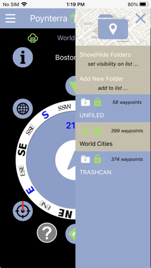 Besides navigation, Poynterra Trekker has powerful waypoint management features. Waypoints with descriptive info can be easily added to user-created folders and copied/moved between them. Waypoints and folders are easily exported and shared (require internet of course), especially with other Poynterra users, in a number of file formats.
