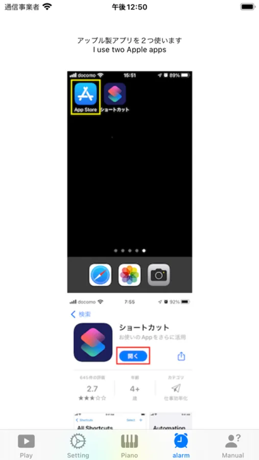 アラームアプリとショートカットアプリを使用します。alarm画面に設定方法の記載があります。