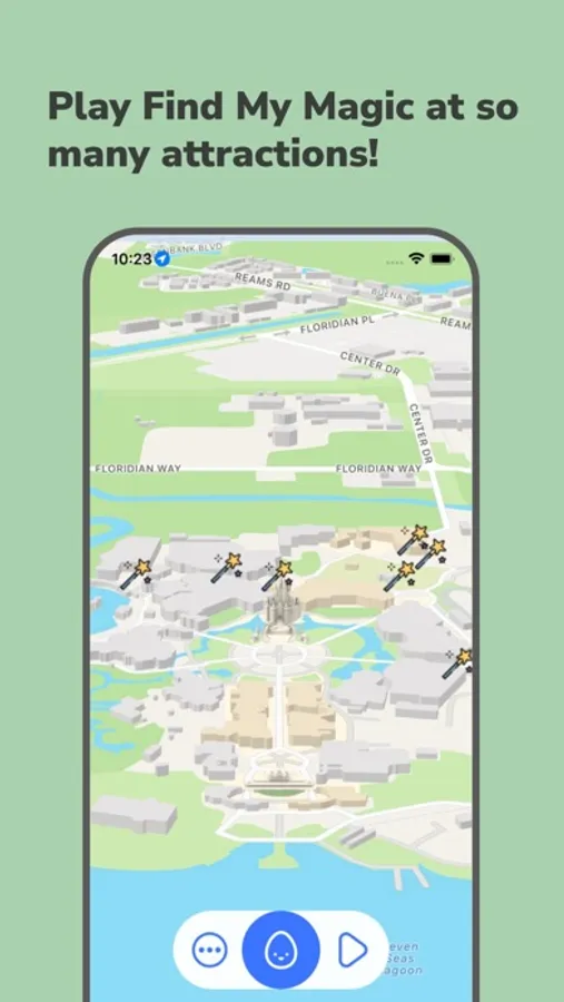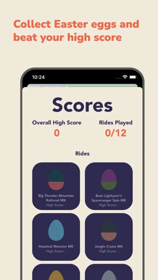 While waiting in line, you can collect hidden Easter eggs around the line queue and compete with your friends and family! Simply select the ride you are at on the map, and use your camera to find as many hidden Easter eggs as you can around you! View all of the eggs you've collected and the rides you've played in the Scores tab.