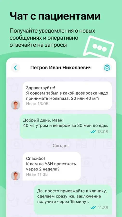 В первой версии приложения, мы реализовали функцию “Чат с пациентом”.