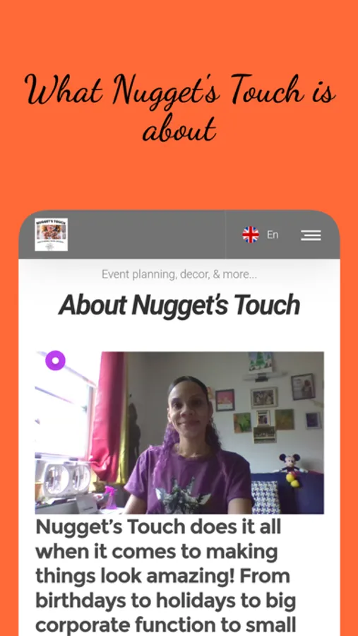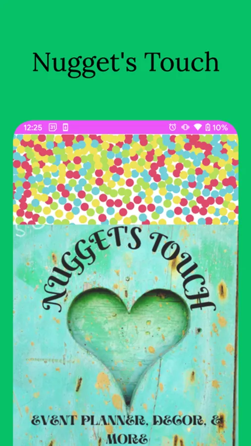 My app is about my creation "Nugget's Touch" which is about planning parties and or all and any types of events. In the app you will find ways to contact me, schedule appointments, check my past work, see testimonials from others, and some more.
