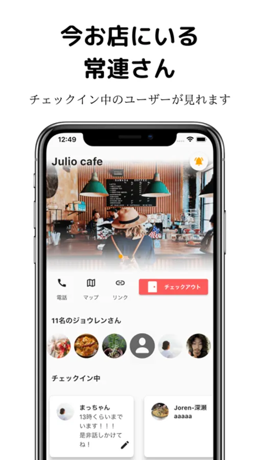 リアルタイムでお店にチェックイン中の常連さんをアプリで見ることができます!