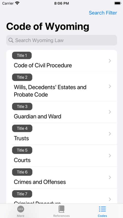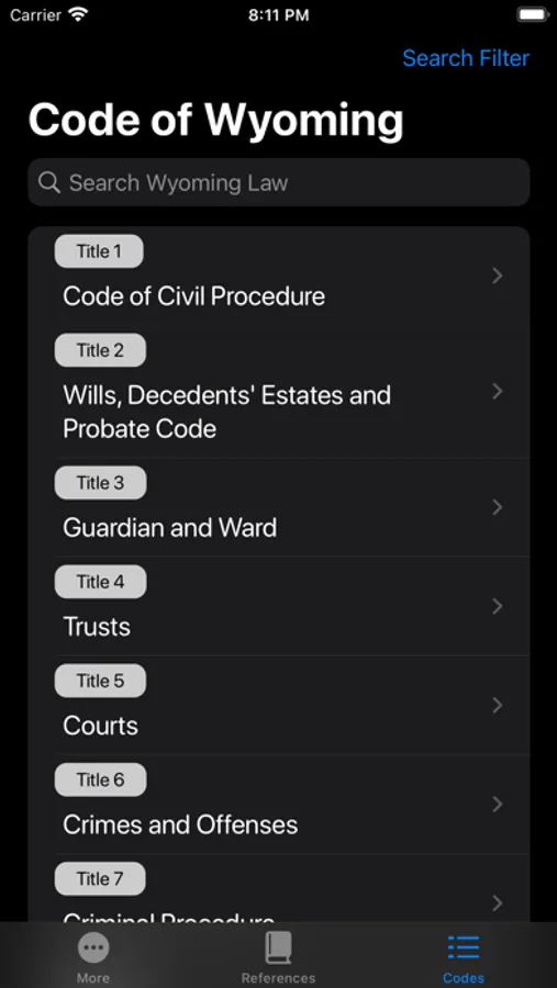 Convenience is crucial. Whether a law enforcement officer or a professional in the field of law, we have simplified the Wyoming state statutes for easy use. We not only made the process of navigating through these laws more intuitive, but have added more functionality to enhance your interaction with said laws. Currently, all codes are alphanumeric searchable, which can be further adjusted via filtering to fit your searching needs. Other conveniences have been added in various ways, such as offering common warnings and bookmarking functionalities. All state statutes can be fully accessed offline.