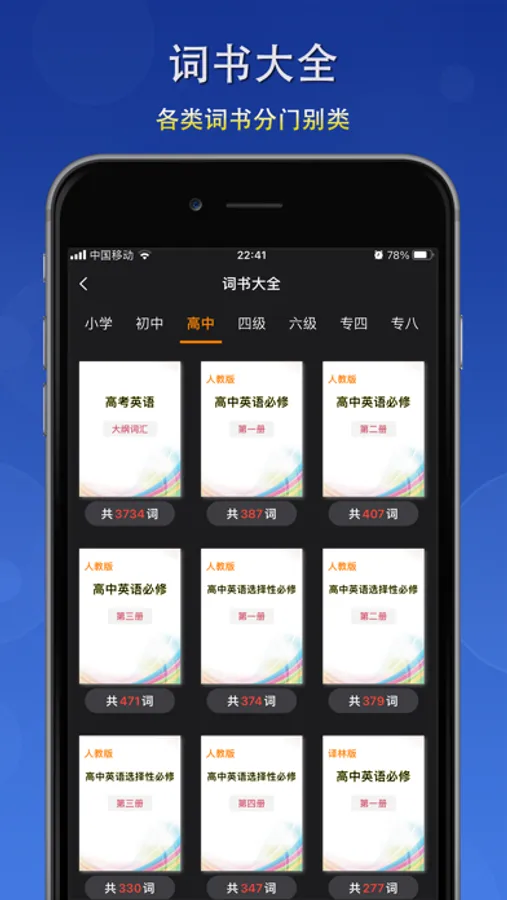 +【词书丰富】:提供小学、初中、高中、四级、六级、专四、专八、考研、PETS、新概念、雅思、托福、GRE、GMAT、BEC等各类单词本。