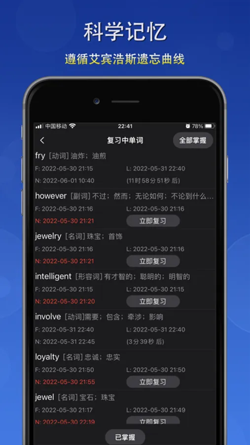 +【科学记忆】:根据艾宾浩斯遗忘曲线提供每个单词的复习点,包括5分钟、30分钟、12小时、1天、2天、4天、7天、15天、30天,会在相应复习阶段和时间点智能计算自动出现在当日复习单词列表中。