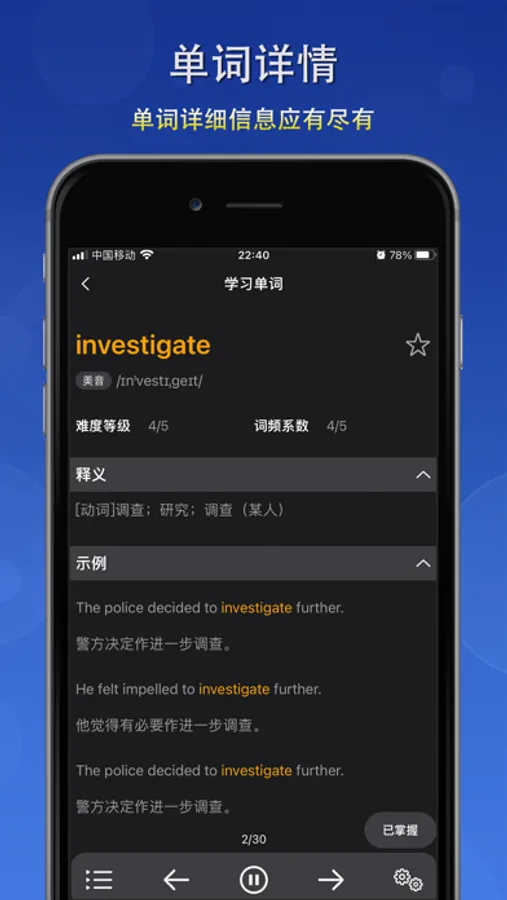 +【信息丰富】:提供每个单词的拼读语音,提供单词的基本释义和多个例句示例以及语音;根据使用情况,给出单词的难度和词频的评估以供学习参考。