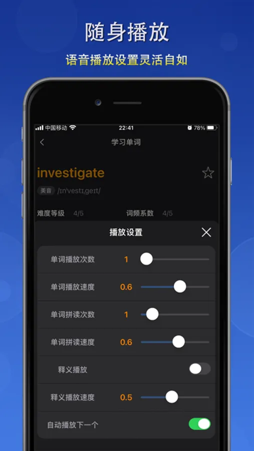 +【灵活播放】:对学习中的单词,可按需调节学习速度和配置,灵活设置单词播放次数速度、单词拼读次数和速度、释义的播放和速度等。