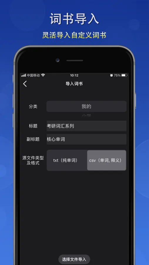 +【导入词书】:支持用户灵活导入自己想学的其他词书,包括txt和csv两种文件格式,txt文件每行一个单词,csv文件每行两列(单词, 释义)。
