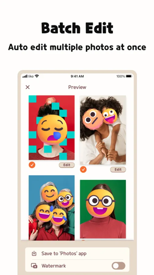 Protect your privacy and add some fun to your photos with EmojiBox - the ultimate app for censoring and anonymizing faces! Effortlessly hide faces with blur, emojis, and pixelation, all automatically detected by the app.