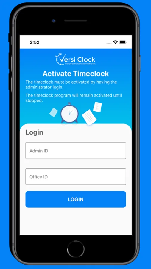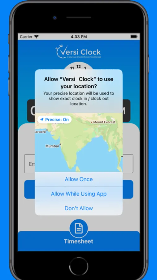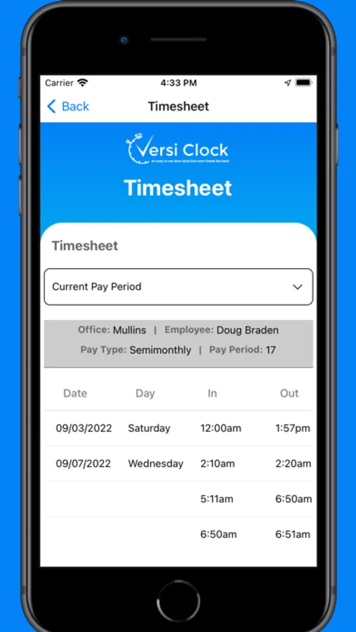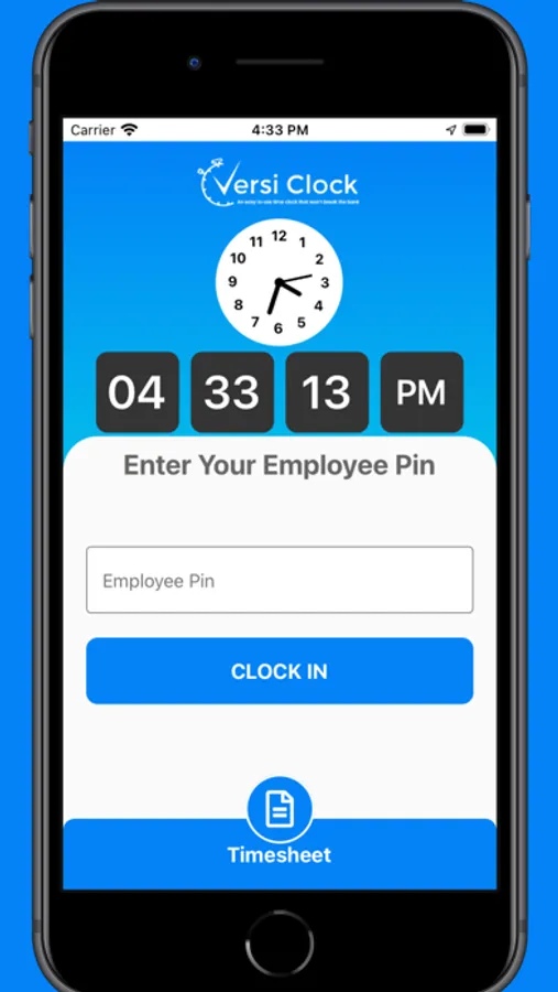 Requires Versiclock service. Allows users to clock in or out remotely, storing GPS location date and time. Even in areas that have poor cellular service the GPS location date and time are stored until cell service is reestablished.