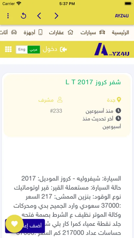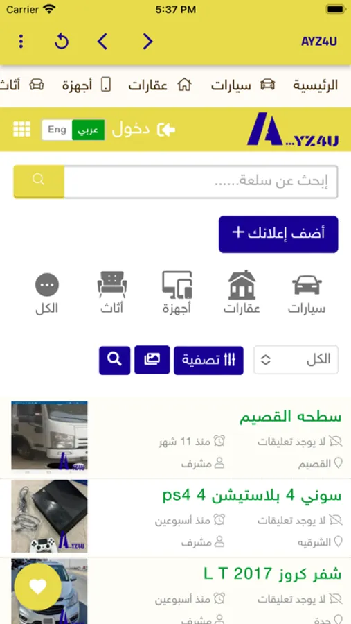 سواء كانت مستعملة او جديدة فى عديد من الاقسام مثل السيارات و العقارات و الاجهزة و غيرها من الاقسام و يستطيع الزوار الاطلاع على تلك الاقسام و المنتجات التى بداخلها و مراسلة صاحب الاعلان للوصول لذلك المنتج بعد ذلك يقوم المشترى بدفع العمولة للتطبيق من خلال احد خدمات الدفع الالكترونى المتوفرة