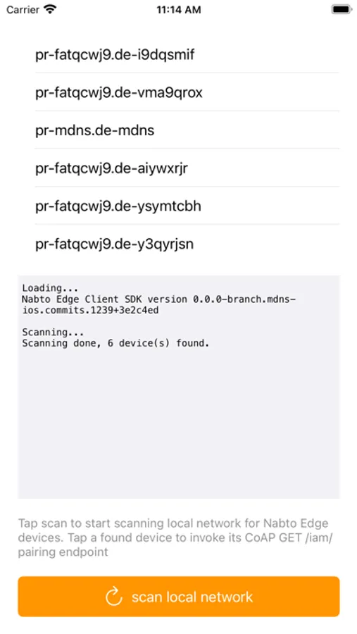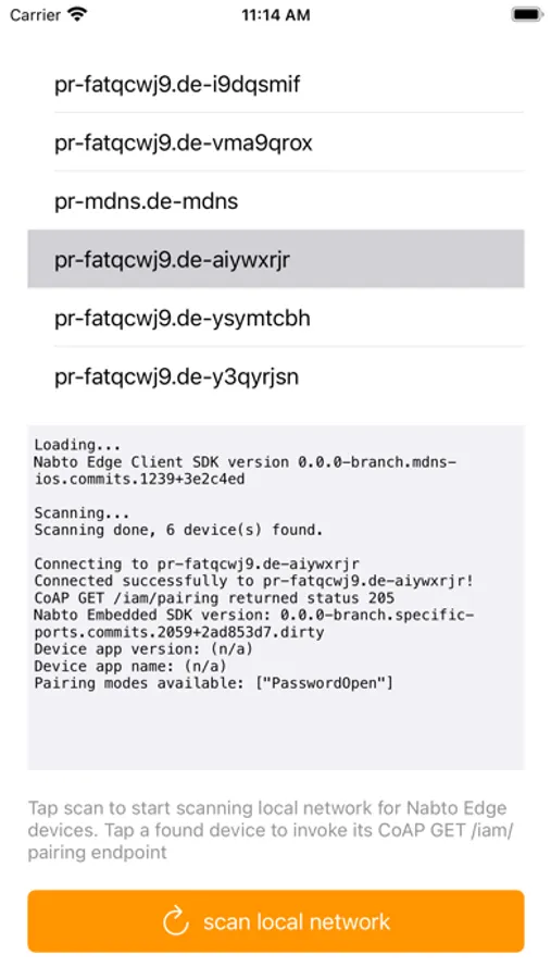 This app allows you to scan for local Nabto Edge enabled devices and retrieve diagnostics information available from found devices using CoAP. This information includes Nabto Edge Embedded SDK version info, vendor assigned embedded app name and version as well as any Nabto Edge IAM pairing modes enabled on the device.