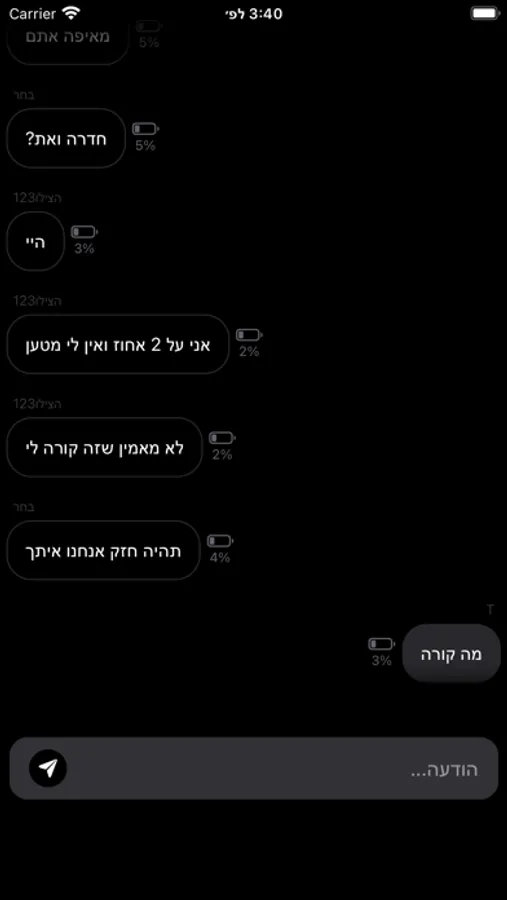 כשטעינת הסוללה יורדת ל5 אחוז או פחות - אפשר לבחור שם משתמש ולהיכנס לצ׳אט.