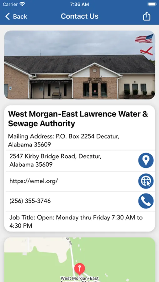 West Morgan – East Lawrence Water and Sewer Authority strives to provide quality water and customer service to all of our customers. We are located at 2547 Kirby Bridge Rd in Decatur, Alabama. Our office hours are from 7:30 AM to 4:15 PM, Monday thru Friday. Our drive thru window is open from 7:30 AM to 4:30PM, Monday thru Friday. An answering service is available for all after hour emergencies.