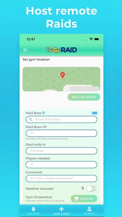 - Enter the Raid Boss name, CP, time left, number of trainers required for the battle and the gym location. Alternatively you may add a screenshot of the gym which will be published both on website and on the app for improved trustworthiness (optional).