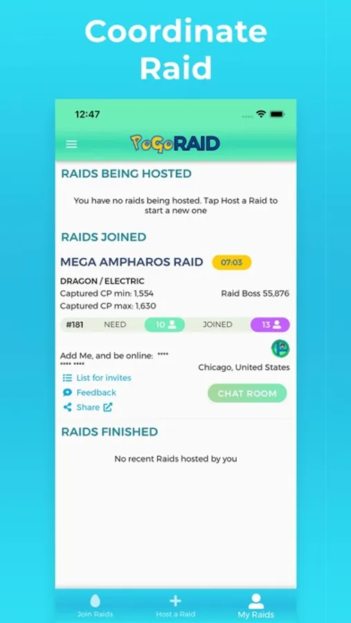 Get to know trainers around the world, join and host remote Raids together conveniently. Use dedicated real-time chat room for each coordinated Raid to better plan your strategy.