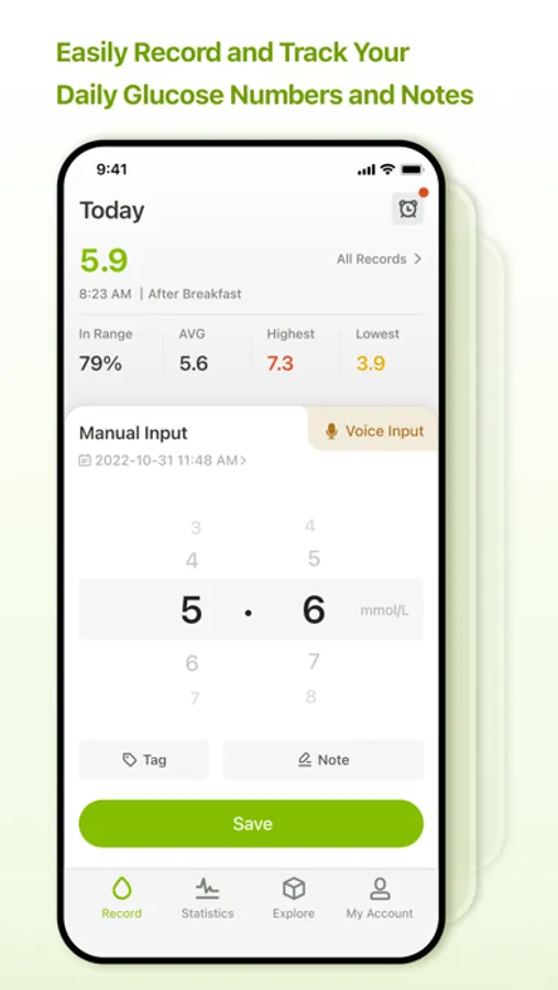 • Customizable labels for each record, such as before exercise, after exercise, before dessert, after dessert, etc.