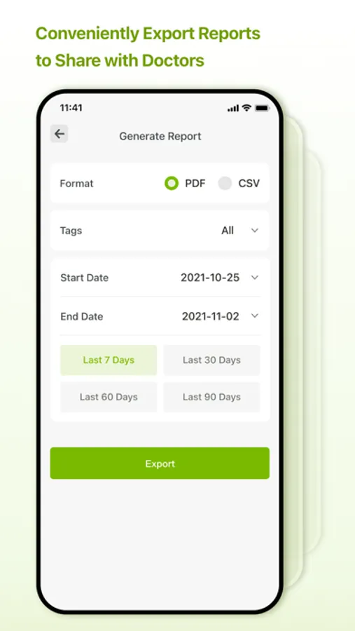 • Easily export and share blood sugar record reports, supporting both PDF and CSV formats.