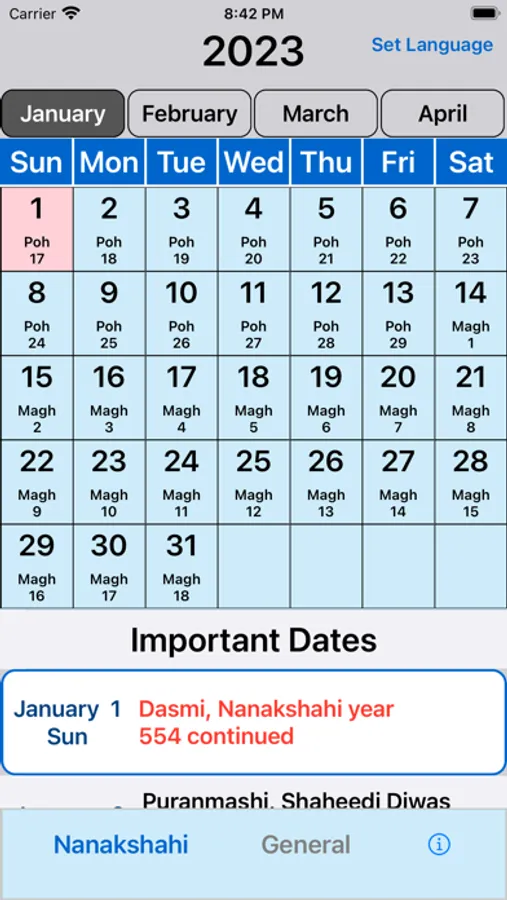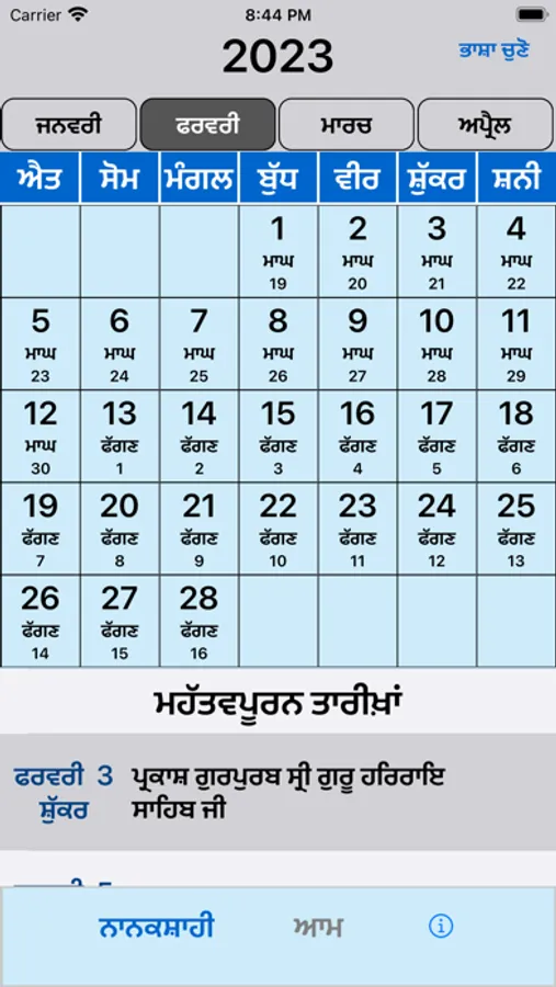 ML Calendar 2023 is the app containing multilingual calendar of three languages i.e. English, Punjabi and Hindi, for the year 2023. It is intended to provide users, important dates about Nanakshahi Calendar (as per SGPC) and General dates of festivals, important events, mainly prevalent in Punjab and its neighbouring states of India.