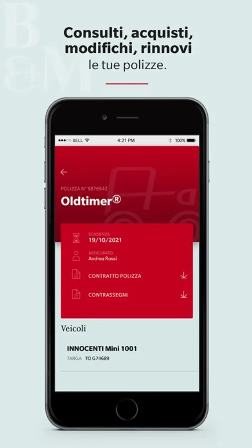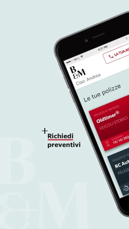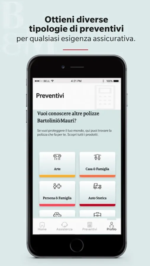Con l’app B&M hai sempre a portata di mano tutto ciò che ti occorre. Accedi e gestisci comodamente le tue polizze sottoscritte con Bartolini & Mauri, denunci sinistri, ottieni preventivi, tracci le tue pratiche e molto altro ancora.