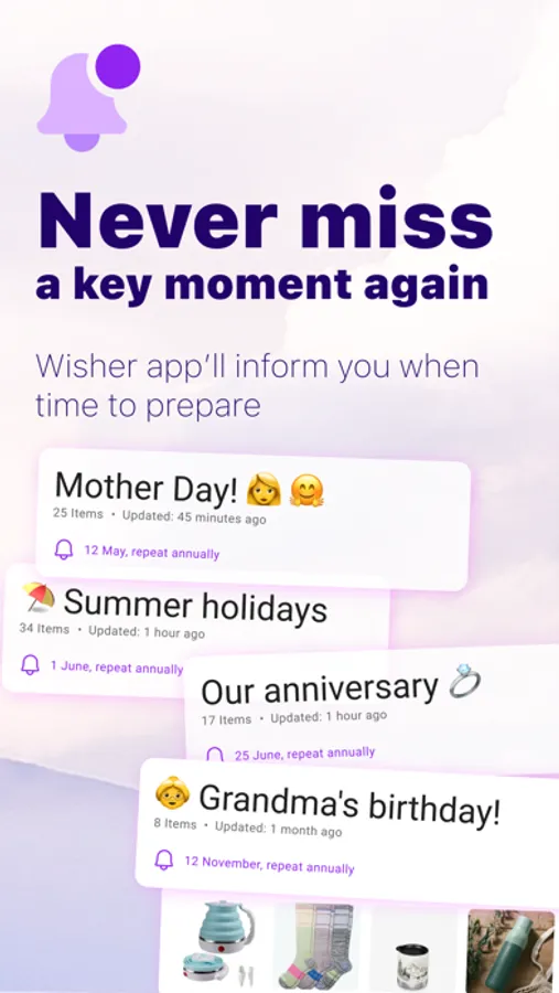 • Everything is organized by collections. We keep up with holidays, cool events, and popular stores. Wisher is the perfect way to organize your wishes, plans, and big dreams.