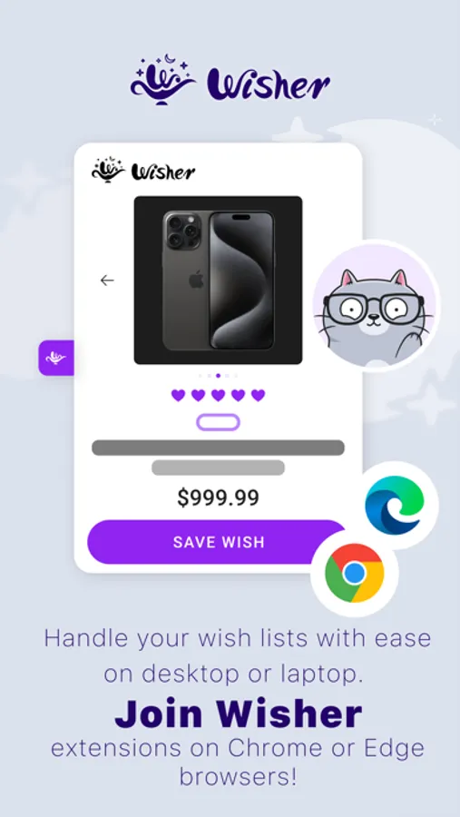 • Easily save your wishes from any website or mobile app. We usually browse online stores just for fun or to buy later. Wisher will be your great assistant in this joyful activity.