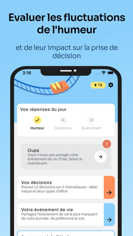 - Effectuez 12 choix journaliers pour que nous étudions l'impact de votre humeur sur votre manière de prendre des décisions