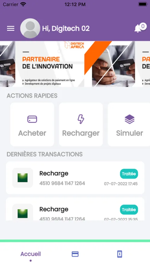 Application mobile de la plateforme Recharge Visa by Digitech Africa. Application permet de faire des achats de cartes prépayées Orabank, UBA et Ecobank. Il est également possible de faire des recharges pour Orabank et bientôt UBA & Ecobank.