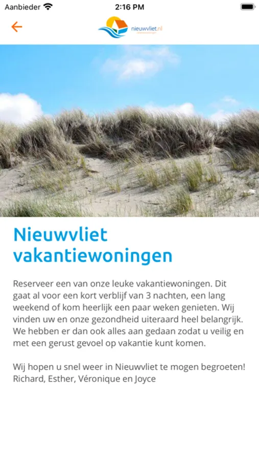 We hebben er dan ook alles aan gedaan zodat u veilig en met een gerust gevoel op vakantie kunt komen. Met de hulp van onze app kunt u tijdens uw verblijf alle aspecten van uw de Zeeuwse kust ontdekken. U vindt in een oogopslag alle nodige informatie en nieuws om uw verblijf zo aangenaam mogelijk te maken.