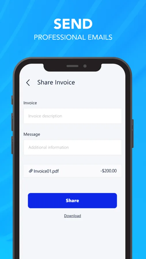 To create your invoice, you only need to tap the + button and then fill in the necessary information on the page that opens. After that, Smart Invoice Maker will automatically create your invoice. You can download your invoice to your device if you want, or you can tap on the platform you want through the application and send it to the person you want.