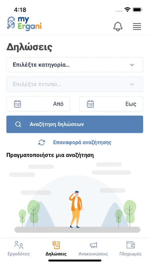 • αναζητήσετε όλες τις δηλώσεις (έντυπα) που έχουν υποβληθεί στο Π.Σ. Εργάνη από τους εργοδότες (π.χ. έναρξη/λήξη απασχόλησης, μεταβολές/υπερωρίες/υπερεργασία, άδειες κ.ά.)