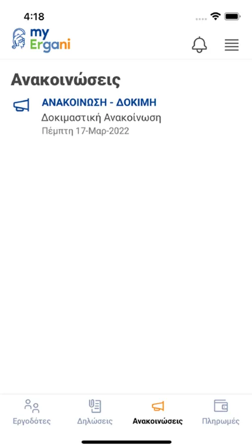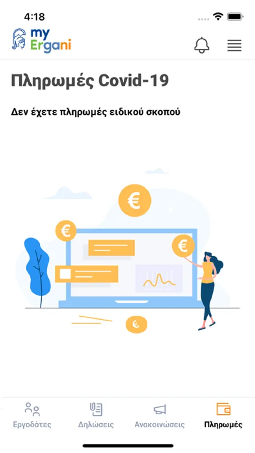 • λαμβάνετε άμεσες ειδοποιήσεις στη συσκευή για κάθε νέα υποβολή εντύπου, πληρωμή ή σημαντική ανακοίνωση από το Π.Σ. Εργάνη