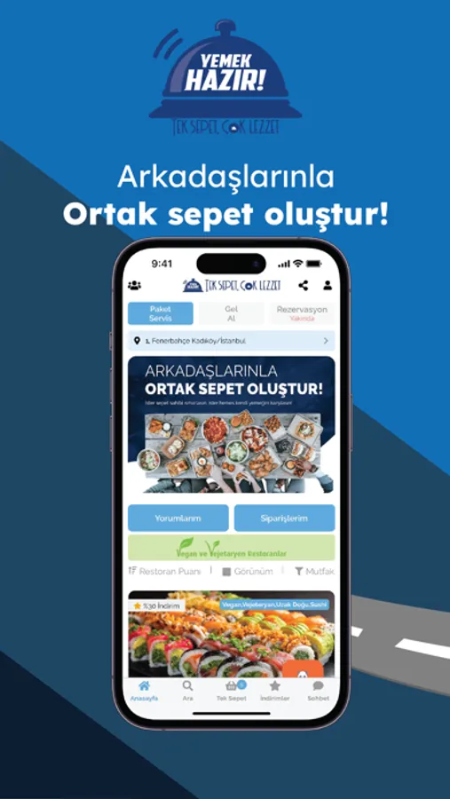 Evde arkadaşlarınla toplandın, herkes farklı bir şey yemek istiyor. Kim uğraşacak şimdi deme! Sepetine arkadaşlarını davet et, herkes istediği ürünü sepete eklesin, ister sen ısmarla, istersen herkes kendi ödesin!