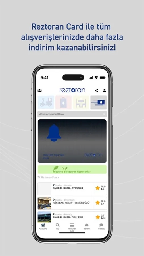 Türkiye’nin ilk gerçek zamanlı rezervasyon ve ilk sosyalleştiren yemek sipariş teknolojisi olan Reztoran üzerinden rezervasyon yapabilir, paket siparişi verebilir ve çok çeşitli indirimler kazanabilirsiniz.