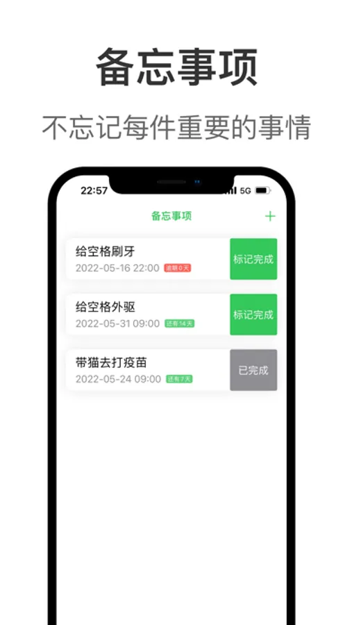 可以添加提醒事项并设定过期时间,支持周期设定,到达指定时间后会发送提醒,可以在主界面标记完成,如果是周期性任务,则会更新至下一周期。