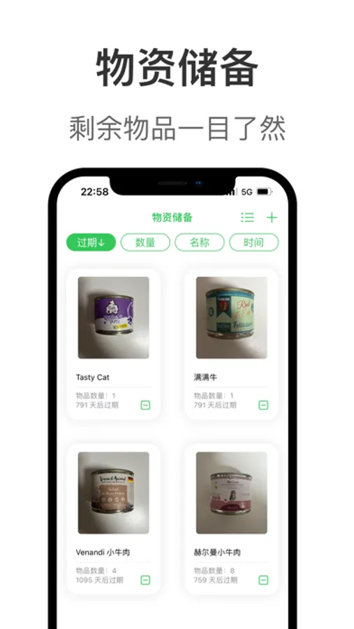 囤了太多的罐头没有记录过期有可能白白浪费,在储备中添加并设定过期提醒,合理安排不同日期罐头的食用顺序,支持详情和列表两种模式,更能方便地消耗存量。