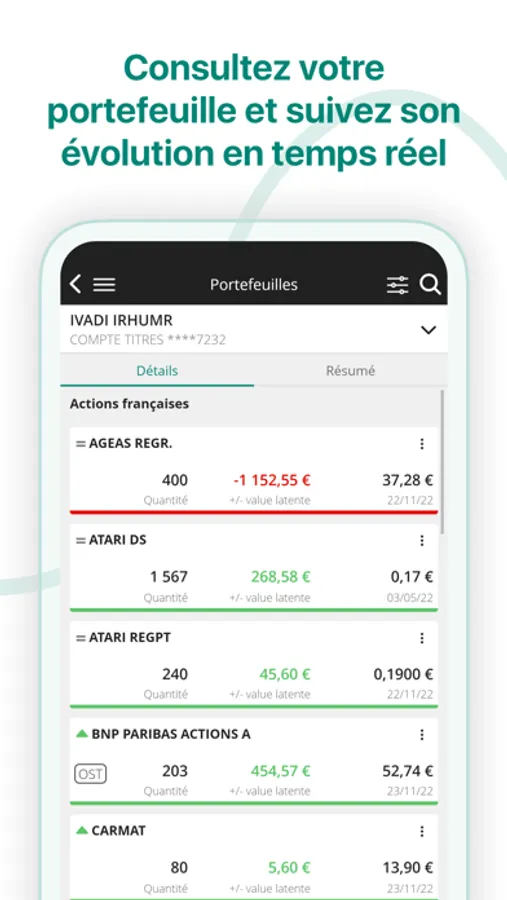 • Retrouvez votre portefeuille en temps réel pour les valeurs Euronext Paris, Amsterdam et Bruxelles et suivez vos ordres en cours.