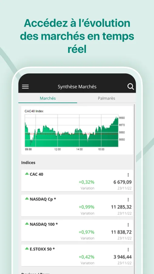 • Accédez à l’évolution des marchés en temps réel (indices, palmarès, …).