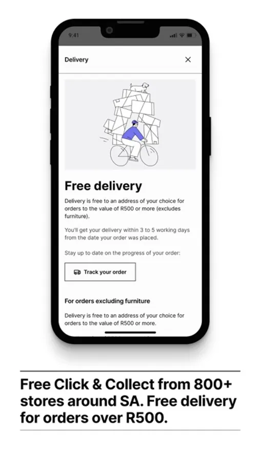 Free delivery for orders over R500 (excluding furniture) to your door within 3 - 5 working days. Free collection from 800+ collection points. End to end order tracking is available for active orders.