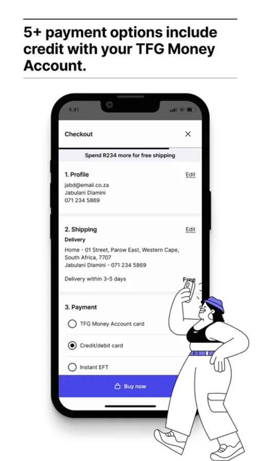 Payment options include Credit and Debit cards (Visa and MasterCard), your TFG Money Account card and EFT. You can also apply TFG gift cards.
