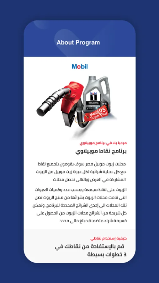 Mobilawy points program enables consumers to collect points upon filling their car with at least 25 liters of Mobil Super Plus 95 at any of the participating services stations that have On the Run or/and upon purchasing any Mobil oil package from the oil types participating in the program. Consumers can redeem the points partially or fully at Mobil partners within Egypt.