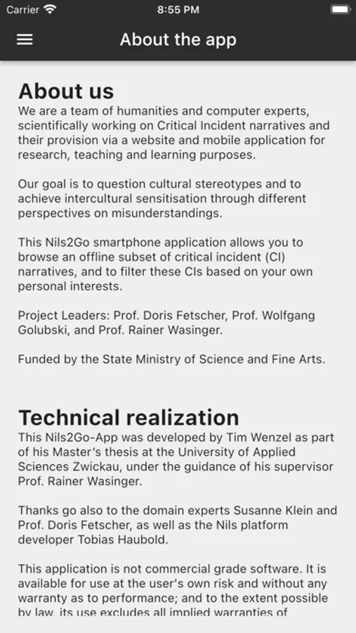 The Nils2Go app allows you to browse an offline set of Critical Incident (CI) narratives, and to filter these CIs based on your own personal interests. CIs provide brief descriptions of situations in which a misunderstanding, problem, or conflict arises as a result of the cultural differences of the interacting parties. They are useful for increasing intercultural awareness. Read what others have experienced and get to know your own and other cultures better!